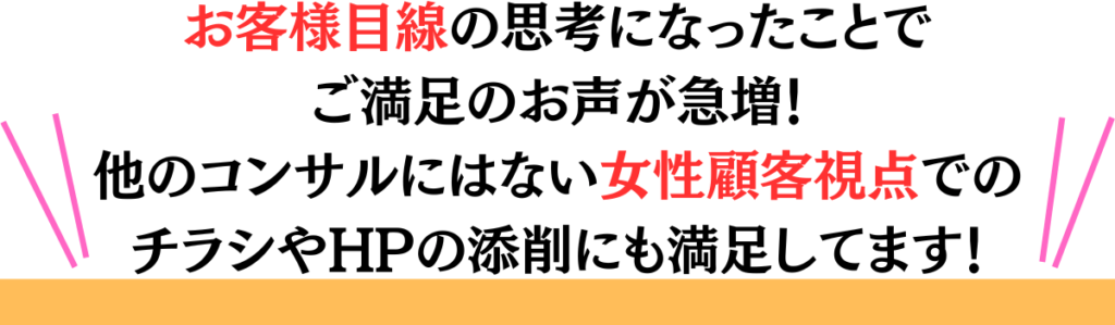他のコンサルにはない、内面的なサポートや心配りや言葉遣い、ビジネスマナーなども学べますし、女性顧客視点でのチラシ添削やホームページの添削にも満足しています。