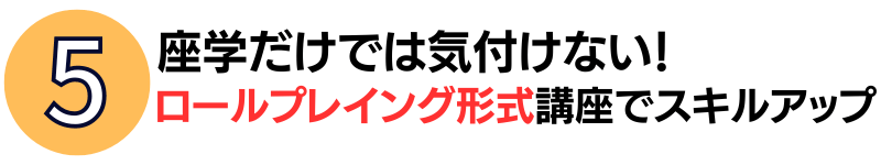 治療家ファンクラブでは、問診カウンセリングや説明・提案などの反復練習ができるようにリアルでのロールプレイング形式も数多く取り入れているため、自分の課題が見えて改善できます。