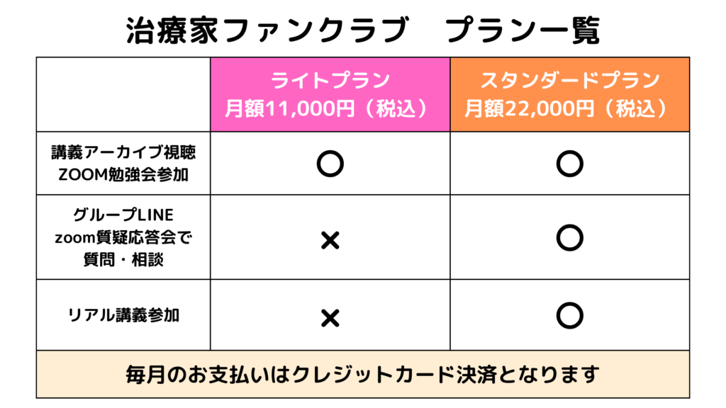 治療家ファンクラブでお伝えしているノウハウは、ただ売上をアップさせるためのものではなく、人間力を磨くことを重視しているため、本来月額5万円以上の価格設定でご提供したいと考えております。